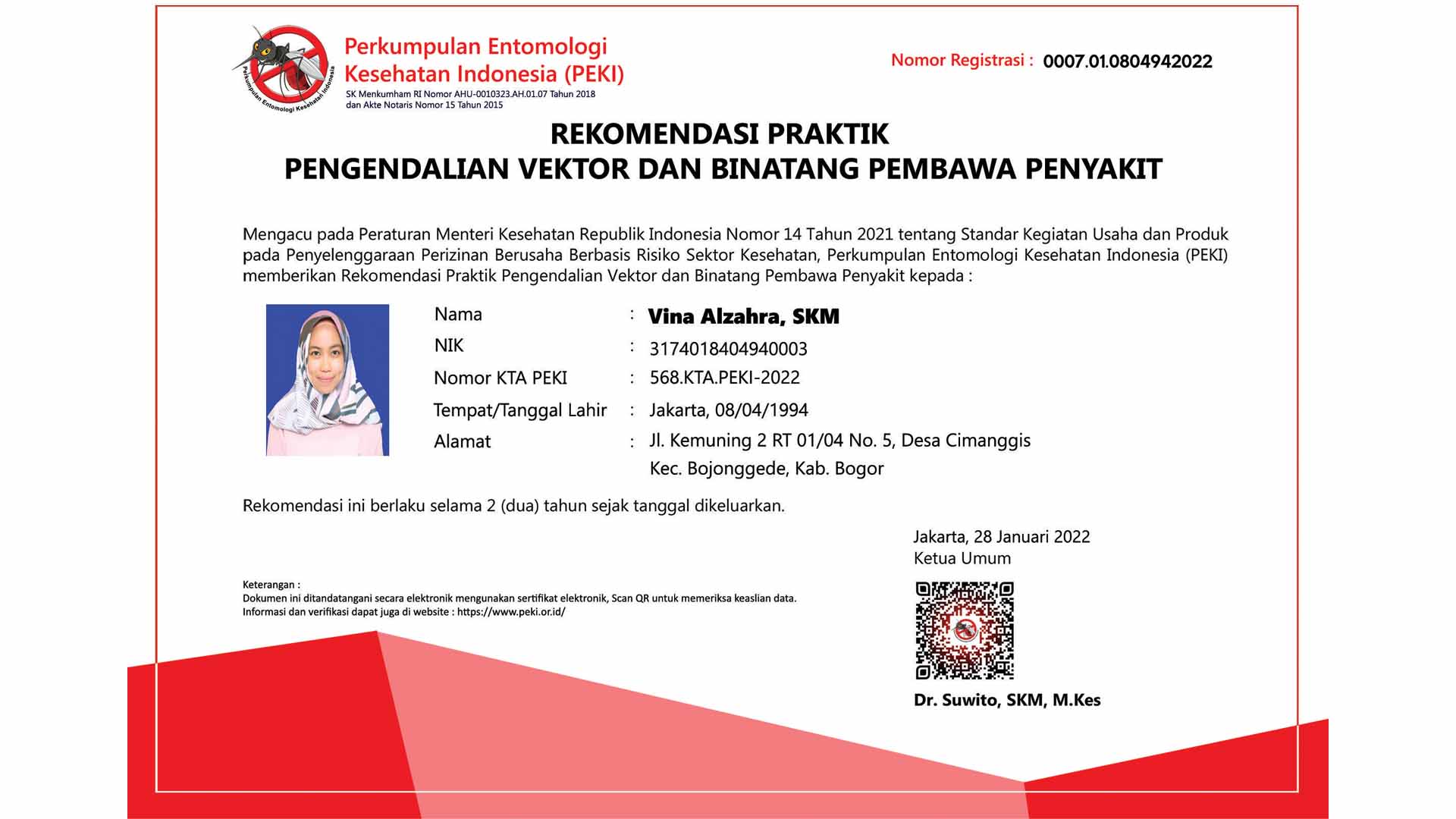 Petugas Entomolog PT. Sumber Resik Indonesia sudah disertifikasi oleh Kementerian Kesehatan dam sudah mendapatkan izin praktik dari PEKI.